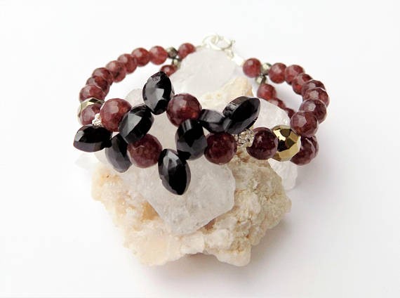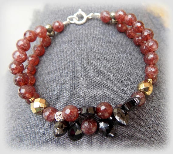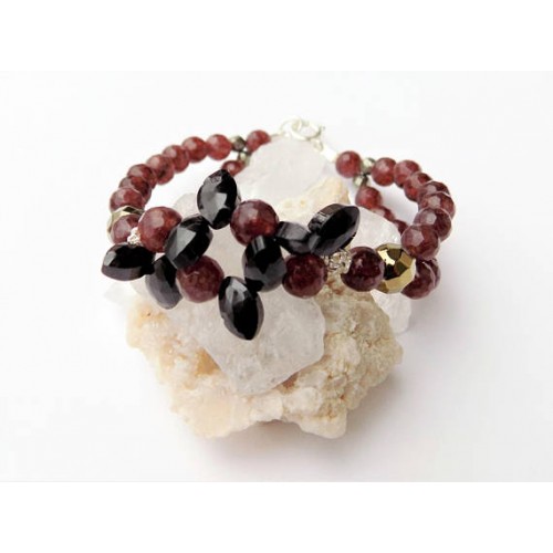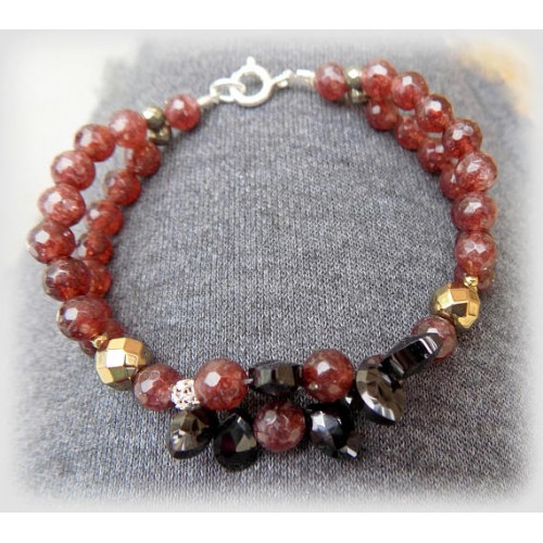 Création unique en pierres naturelles de jaspe brun, spinelle noire et pyrite dorée Matériaux utilisés: Argent massif, Pierres fines Pièce unique double rang de superbes perles à facettes mariant le brun translucide du Jaspe aux reflets dorés de la pyrite mettant en relief les marquises de spinelle au centre du bracelet... Style unique, hyper raffiné pour grandes et petites occasions... Il se compose des perles suivantes : - perles à facettes de jaspe brun de 6 mm. - perles à facettes de pyrite dorée de (2) 8 mm, (4) 4 mm et (4) de 2 mm. - perles de spinelle Marquise (8) de 9 mm x 5 mm. - perles filigranes en argent massif 925 (2) de 4,5 mm. Le bracelet double rang mesure 19 cm fermoir compris. Les apprêts et le fermoir (poinçonné) sont en Argent massif 925 (de Fabrication française). Quelques propriétés et vertus en lithothérapie/ Composition/Spinelle : Silicate (ou oxyde) d’Aluminium et de Magnésium. Etymologie : pour certains vient du latin spinella, qui signifie petite épine mais pour dautres du latin spinella “clarté d’étoile”. Dureté élevée de 7,5 à 8 (échelle de Mohs). Gisements principaux : Brésil, Etats-unis, Thaïlande, Sri Lanka, Birmanie, Madagascar, Tadjikistan. LA PIERRE DE PROTECTION PAR EXCELLENCE...efficace même de petite taille - Taux vibratoire élevé (jusqu’à 130 000 unités Bovis) , contre des énergies négatives et malveillantes (magie noire, manipulations diverses et les tentatives d’intrusions psychiques dures) . Décrite souvent comme la plus puissante actuellement ; elle nous aide à aller jusquau bout des choses. Proche de la Tourmaline mais plus puissante et résistante grâce à son appartenance au système cubique qui lui confère une énergie structurante et fortement concentrée. Son influence peut nous stimuler « à sortir des sentiers battus » et à rebâtir, fonder de nouvelles idées à partir de ses racines en passant par un travail de deuil ; en somme le Spinelle noir aide à abandonner le passé afin que nous puissions avancer plus librement vers l’avenir. Plan mental et émotionnel : Cette pierre est réputée redonner confiance en soi et ses propres capacités. Utile aux personnes qui ont tendance à séparpiller et à manquer demprise sur le réel car elle enracine, pousse à aller jusquau bout des projets, désirs, et objectifs en procurant lénergie nécessaire pour y parvenir. Plan physique : Conseillé pour faciliter la désintoxication des intestins et du système digestif. Renforce les jambes, le système de reproduction féminin et masculin (prostate), la vessie... Le Spinelle est Associé au chakra racine, de base. Quelques propriétés et vertus en lithothérapie/ Composition/PYRITE DOREE alias OR DES FOUS (pyrite de fer) : sulfure de fer. Tradition : La pyrite était connue des anciens qui la baptisèrent ainsi pour son rapport avec le feu (du grec pyros). Les Incas en faisaient des miroirs, grandes feuilles luisantes quils plaçaient dans les tombeaux, dou le nom de pierre des incas. Appelée aussi lor des fous, elle a désillusionné nombres de chercheurs dor. Principaux gisements : Pérou, Bolivie, Etats-Unis, Espagne, Mexique, Roumanie, Suède. Pierre de prédilection des architectes, des informaticiens, des scientifiques en général autant que des écrivains, inventeurs et artistes … dont elle stimule les facultés de mémoire et desprit logique complétées par linspiration créatrice. Réputée Pierre de protection, la pyrite transmute et débarrasse des énergies négatives environnantes. Aide à redonner confiance en soi aux personnes se sentant infériorisées. Pierre solaire par essence, elle recharge rapidement le chakra du plexus rétablissant de lénergie en cas de fatigue et d’épuisement nerveux. Plan mental et émotionnel:libère les émotions contenues par transmutation (dégagement fulgurant et instantané permettant de trouver le sens véritable à nos blocages) et redonne lestime de soi tout en replaçant légo à sa juste place. Excellente pour la mémoire, le sens de lorganisation, elle stimule les facultés intellectuelles...Egalement pierre du concret, de la pensée rationnelle, de la restructuration du mental cet la Pierre des bâtisseur; rigoureuse, constructive, de gestion, de structure, d’ordre... Plan physique : Pierre bénéfique pour les voies respiratoires, les bronches, les poumons, toutes les infections dans ce domaine. Elle régule sensiblement le diabète. Elle traite les problèmes intestinaux et digestifs et apaise les inflammations de lestomac et du pancréas. Favorise une meilleure élimination, stimule la détoxication de l’organisme (Chakra plexus et base). Quelques propriétés et vertus en lithothérapie/ Composition/Jaspe brun : dioxyde de silicium (quartz, rhomboédrique, secondaire) qui peut aussi contenir de largile. Les Jaspes sont vénérés par les peuples et les civilisations anciennes à travers le monde comme des pierres sacrées et puissantes de protection, à la fois pour le domaine physique et spirituel. Le Jaspe brun, appelé marbre égyptien, était lun des Jaspes traditionnels