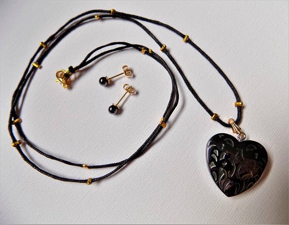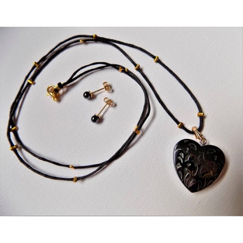 Création unique - Parure Tormhéa - hématite (pierre fine) - collier pendentif + clous doreille - plaqués or 18 K. Pièce composée dun long collier noir plaqué or qui met en valeur un cœur en Hématite assorti à des clous doreille en pierre dHématite également. Ensemble sobre et lumineux, facile à assortir et portable en toute occasion. Style inclassable, dun minimalisme raffiné. Parure collier/Pendentif/Bo Hématite naturelle. - Collier de 67 cm (sans le fermoir de 1,5 cm mousqueton en laiton plaqué or 18 K/Fabrication française ainsi que tous les apprêts) est fait main avec du cordon de coton noir de 1 mm et des perles écrasées plaquées or tous les 4 centimètres. Au milieu lespace est de 2 centimètre où se centre (avec une bélière plaquée or 18 K/Fabrication française) le pendentif : un gros cœur sculpté en pierre véritable dHématite denviron 2,5 cm de largeur et 2,6 cm de hauteur et 6 mm dépaisseur. - Assortis, les clous doreilles sont de 16 mm de longueur plaqués or 18 K/Fabrication française - les 2 perles dHématite sont de 4 mm de diamètre. Quelques propriétés et vertus en lithothérapie/Hématite Composition : oxyde ferrique. Elle est très stimulante physiquement et nous soutient dans nos efforts car elle renforce la volonté et l’envie de réaliser ses objectifs sans se laisser détourner ou décourager d’aucune manière.. Ces vertus apaisantes en font un bon antistress au quotidien. Elle agit positivement sur le système sanguin : purifie et fluidifie le sang, équilibre le taux de globules blancs et rouge. Accélère la coagulation sanguine. © Bijoux-Natdev 2015-2019. Tous droits réservés. (Les copies mêmes partielles de textes, images ou modèles présents dans cette boutique, sans accord préalable, quel que soit le mode de reproduction, sont strictement interdites).