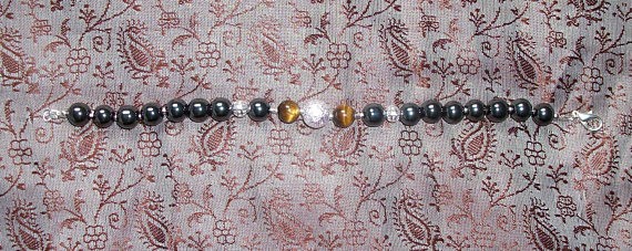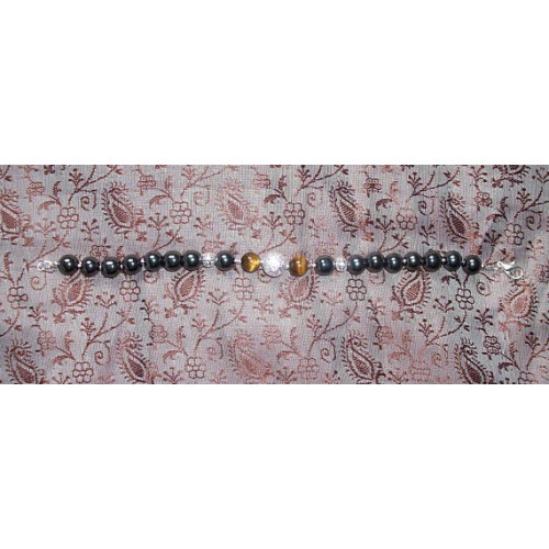 Bracelet de 20 cm en perles rondes dhématite 9 mm et 2 perles doeil de tigre, perles intercalaires plaquées argent Création unique de bracelet en pierres dhématite véritable et oeil de tigre doré / plaqué argent. Le bracelet est réalisé avec des perles dhématite de 9 mm avec au centre une perle de 10 mm scintillante plaquée argent encadrée par deux perles de 8 mm doeil de tigre doré, plus haut deux perles filigranées de 4 mm plaquées argent...Les autres perles plus petites et intercalaires sont également plaquées argent. Le bracelet mesure 20 cm fermoir compris. Tous les apprêts sont également plaqués argent. Quelques propriétés de la pierre dhématite / Composition: oxyde ferrique. Elle est très stimulante physiquement et nous soutient dans nos efforts car elle renforce la volonté et l’envie de réaliser ses objectifs sans se laisser détourner ou décourager d’aucune manière.. Ces vertus apaisantes en font un bon antistress au quotidien. Elle agit positivement sur le système sanguin : purifie et fluidifie le sang, équilibre le taux de globules blancs et rouge. Accélère la coagulation sanguine. © Bijoux-Natdev 2015-2017. Tous droits réservés. (Les copies mêmes partielles de textes, images ou modèles présents dans cette boutique, sans accord préalable, quel que soit le mode de reproduction, sont strictement interdites).