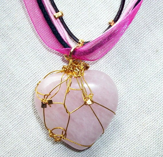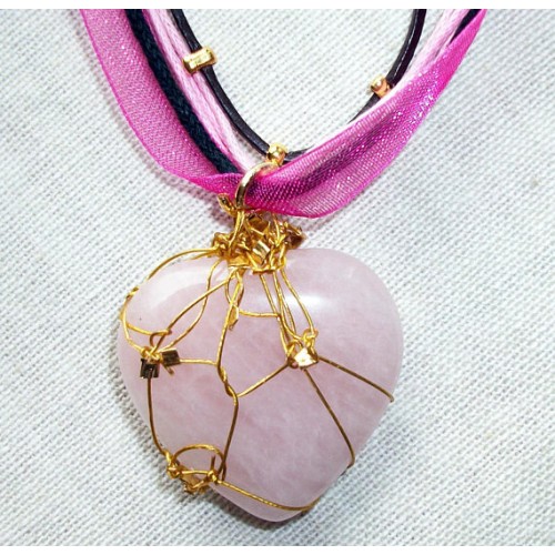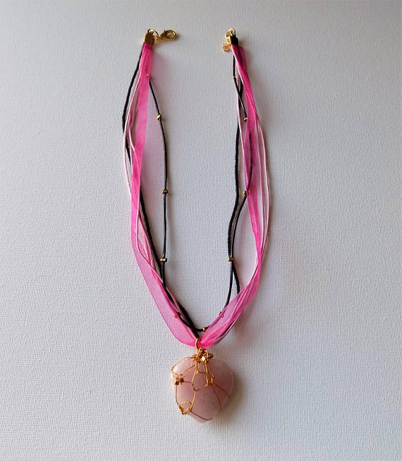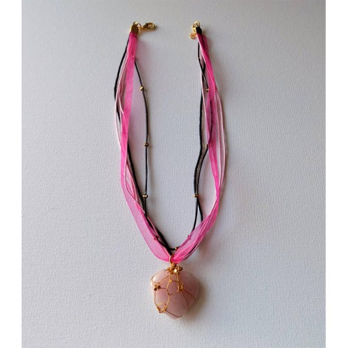 Collier coton, organza et cuir avec pendentif en quartz rose entrelacé dun fil doré. Création unique. 43 cm de longueur avec une chaîne dextension de 3 cm. Collier coton, organza et cuir avec pendentif en quartz rose entrelacé dun fil doré. Le collier se compose de 3 cordons en coton rose 1 mm, 1 autre noir, 1 ruban en organza rose vif dune longueur de 44 cm et dun cordon en cuir marron foncé de 1 mm avec perles en plaqué or plus court (environ 43 cm). Le coeur en pierre fine de quartz rose est retenu par un maillage avec du fil doré câblé et des perles plaquées or écrasées qui enserrent et entrelacent la pierre. © Bijoux-Natdev 2015-2017. Tous droits réservés. (Les copies mêmes partielles de textes, images ou modèles présents dans cette boutique, sans accord préalable, quel que soit le mode de reproduction, sont strictement interdites).