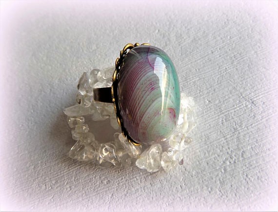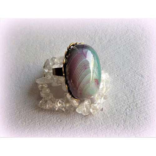 Création unique en pierre naturelle dAgate rayée sur une monture en métal ajouré bronze. Style inclassable un brin baroque, boho chic ; une bague qui ne passe pas inaperçue avec sa belle épaisseur de 14 mm ! Les couleurs de lAgate rayée passant du vert au vert clair dominant rayé de violet avec pointe de rose et rouge sont particulièrement mises en valeur par le bronze. Pièce unique - bague composée dun cabochon dAgate rayée naturelle et dune monture bronze avec plateau filigrane ovale. - Dimensions du plateau filigrane bronze avec cabochon dAgate : 31 mm x 22 mm x 14 mm. - La monture de bague est en métal alliage bronze, réglable environ n° 58 à 63, baguier pour se repérer ci-dessous - https://galerie.alittlemarket.com/galerie/wall/d8845cefe9566efc01465f4668d985ae.jpg Garanti sans plomb, nickel et cadmium. Quelques propriétés et vertus en lithothérapie/ AGATE - Composition : dioxyde de silicium/calcédoine transparente avec dendrites de hornblende verte (agate mousse). L’agate est une pierre d’ancrage qui a pour vertu de favoriser labondance et la chance sur tous les plans. Plan physique : Elle est conseillée pour purifier le sang et nettoyer les poumons, améliorer les problèmes rénaux (séance sur zone), réguler le système lymphatique (chakra cœur) et stimuler le système immunitaire. Les propriétés de lagate sont dapporter l’équilibre émotionnel, physique et intellectuel en éliminant les tensions énergétiques à lintérieur du corps. Egalement anti-stress, elle apaise, calme langoisse, dissipe la colère et rétablit le sentiment de confiance en la vie. Sur le plan psychologique et émotionnel elle favorise la sincérité, lauto-analyse, la clairvoyance et accroît vivacité et concentration desprit. © Bijoux-Natdev 2015-2017. Tous droits réservés. (Les copies mêmes partielles de textes, images ou modèles présents dans cette boutique, sans accord préalable, quel que soit le mode de reproduction, sont strictement interdites).